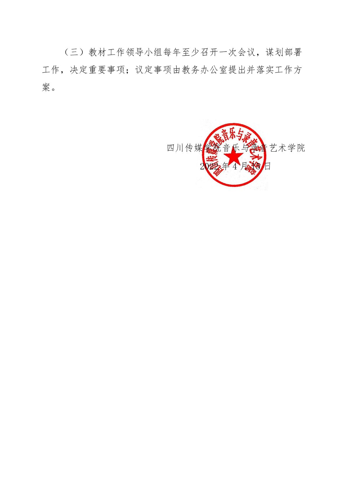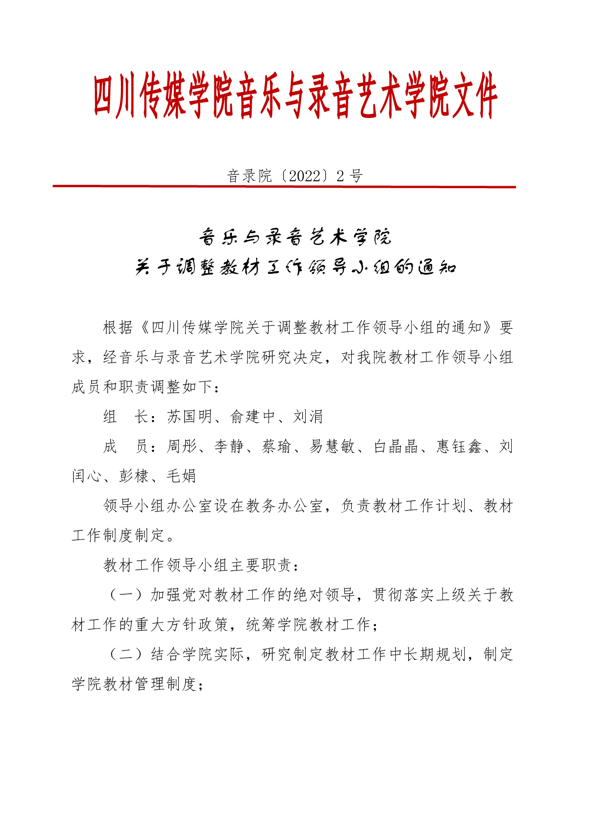 音乐与录音艺术学院关于调整教材工作领导小组的通知