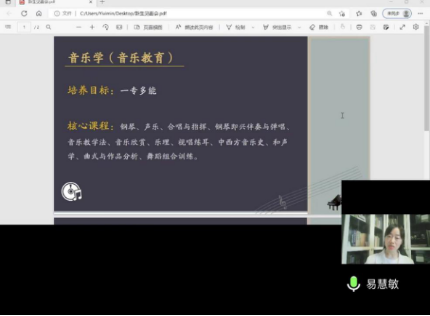 易慧敏老师强调,音乐学专业着重培养音乐教育方向人才,以一专多能、全面发展为宗旨。要求学生能适应教师专业化的发展要求,系统掌握音乐教育的基础理论与方法,具备运用所学知识分析、解决实际问题,进行教学研究的能力;能够从事中小学音乐教育新课程改革的教育教学工作;具备在社会文艺团体、艺术研究单位和群众文化部门及社区艺术文化机构的文艺活动组织、策划等能力。