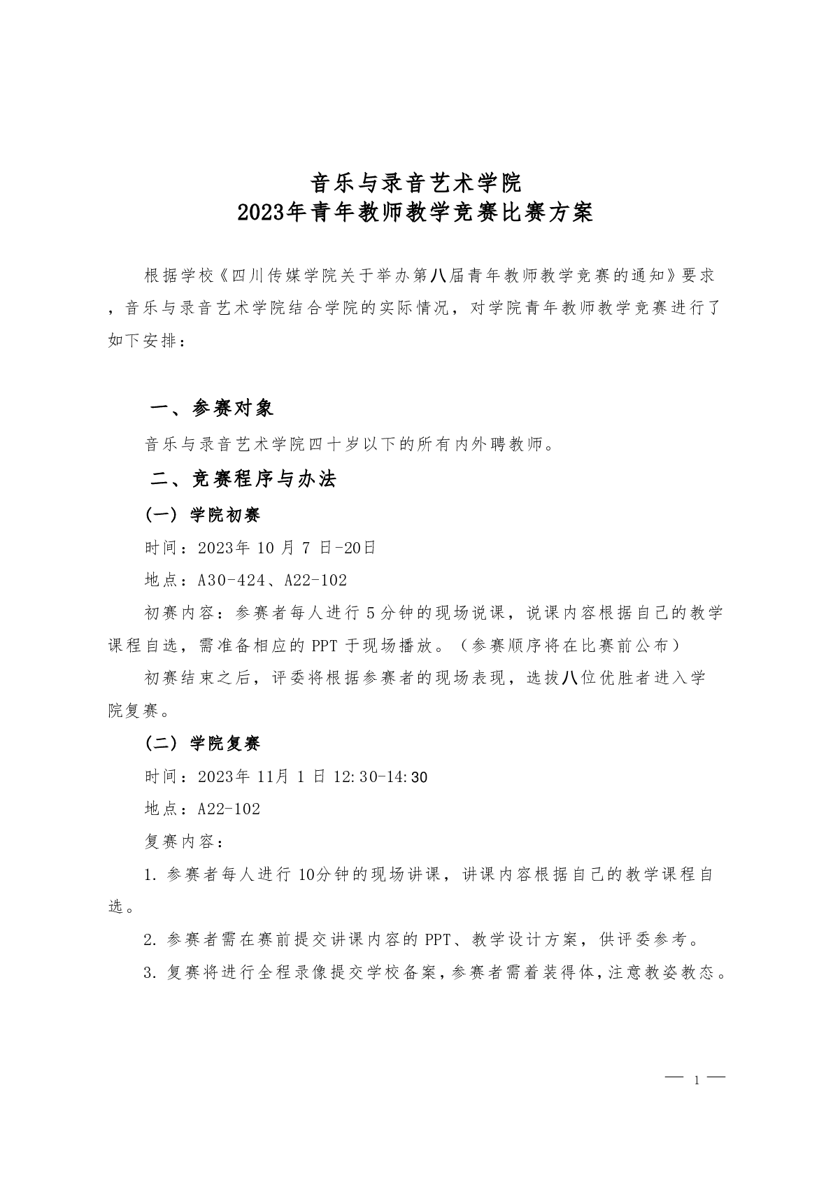 音乐与录音艺术学院2023年青年教师教学竞赛比赛方案