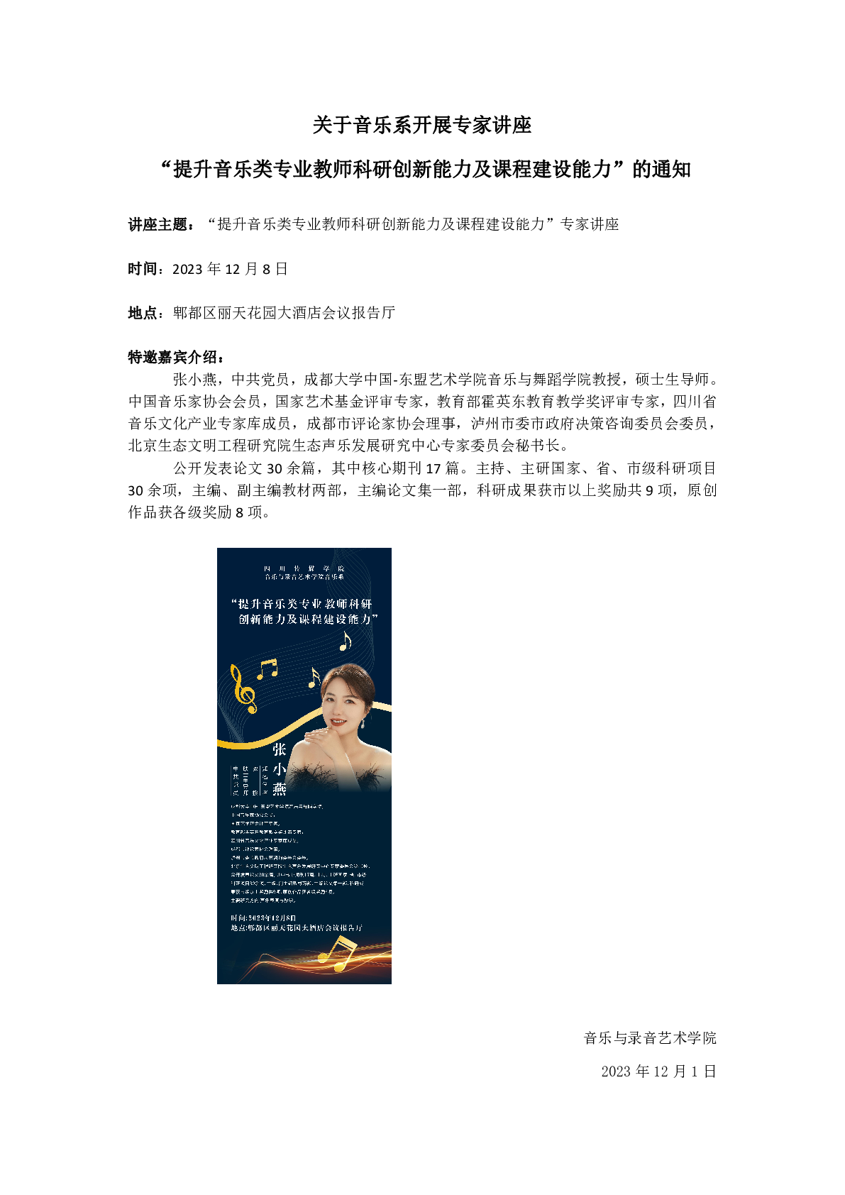 关于开展专家讲座 “提升音乐类专业教师科研创新能力及课程建设能力”的通知