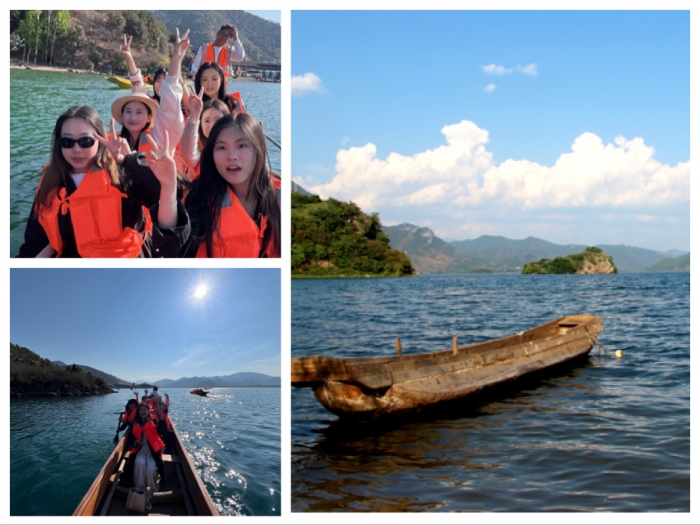 乘坐摩梭人独特的交通工具——猪槽船,行进在水域宽广的泸沽湖上,听摩梭人传说、看海菜花冰清玉洁点点荡漾、望碧空千里之下候鸟飞过,同学们兴致勃勃,与当地人对歌。