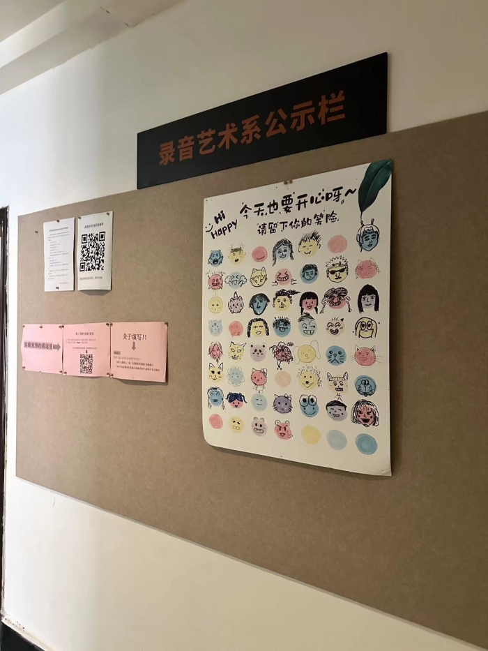 第二项活动是在音乐与录音系大厅以及走廊放置可以供学生自由绘画的展板,让学生课间之余绘上笑脸,增加课间活动的趣味性,不论是画画的同学还是围观的同学都在各式不一笑脸形成的过程中感受到快乐和放松是这次活动的最终目的。