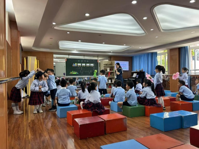 在音乐教室一,学生们观摩了一年级的音乐课《火车来啦》,这堂生动活泼的音乐课以情景教学法展开,老师用惟妙惟肖的"呜——"汽笛声和富有韵律的"咔嚓咔嚓"车轮声,形象地引出歌曲的典型节奏型。在欢快的律动中,学生们自然地掌握了歌曲的基本节奏和旋律。随后,老师将学生分成“溪流组”、“高山组”“花朵组”“火车组”,将音乐要素的学习自然融入游戏环节,将律动、节奏模仿与角色扮演完美融合,最终呈现出一场生动活泼的表演唱,整个课堂仿佛变成了一个欢乐的音乐剧场。教学中教师巧妙引导学生关注旋律的起伏、节奏的变化以及乐句的结构特点,整堂课严格遵循艺术课程标准“让学生在体验中学习”的要求,通过多元方式让每个孩子都成为音乐的主动参与者,在欢声笑语中收获了音乐素养的全面提升。