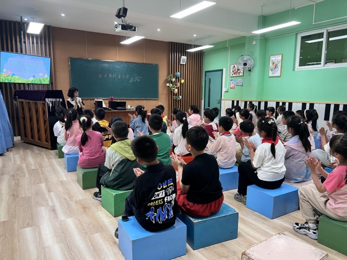 在音乐教室二,一堂以《春天举行音乐会》为主题的三年级音乐课同样精彩纷呈。课程伊始,老师以一段优美的律动带领学生进入春天的意境,引导孩子们闭眼聆听想象中的春天声音——鸟鸣、溪流、微风,将学生自然带入音乐氛围。在攻克节奏难点环节,老师创新性地采用"春雨滴答"的拟声游戏,让学生们带着节奏朗诵歌词,把"沙沙沙"的春雨声与歌词韵律完美结合。学唱环节中,老师用钢琴伴奏引导学生感受旋律的起伏,通过分组轮唱、接龙演唱等丰富形式,让每个孩子都能充分体验歌曲的韵律美。最令人惊喜的是创意实践部分,学生们分组使用串铃模拟鸟鸣、鼓声表现春雷、自制的沙锤演绎春雨,共同奏响了一曲生动的"春天交响乐"。整堂课将音乐要素与自然之声巧妙融合,充分展现了"以美育人"的教学理念。