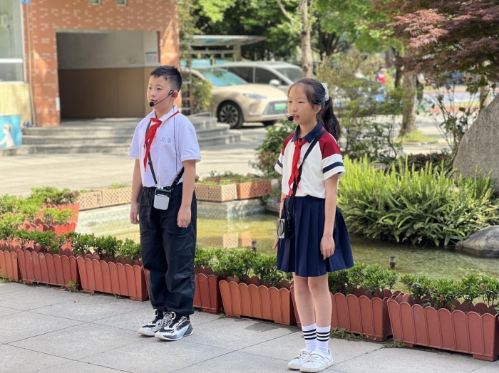 上午10时,人北实验小学佩戴着鲜艳红领巾的小讲解员们热情洋溢地为我们展开了一幅生动的校园画卷。他们如数家珍地介绍着校园的每一处建筑,从书香四溢的教学楼到记录精彩瞬间的照片墙,再到充满生机的“百草园”,每个角落都承载着独特的校园记忆。最令人动容的是,这些可爱的讲解员们用清澈纯净的嗓音为我们演唱了校歌《梦想启航》,音乐表演专业的同学们不自觉跟着打起节拍,稚嫩真挚的歌声在校园上空久久回荡,让我们真切感受到了音乐教育的温度和力量。