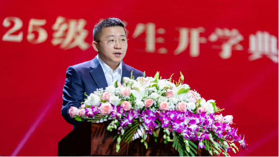 校长左旭舟教授代表全校师生员工,向来自全国各地的5000余名新同学表示最热烈的欢迎,并向辛勤培育他们的父母和亲友表达诚挚的敬意。左校长指出,学校始终坚持“根植传媒、产教融合、园校合一、实践育人”的办学特色,依托东西校区占地2000余亩的现代化校园、国家级产业基地、国家级实验室及成都影视城产业功能区等优质资源,为教育教学提供了与传媒产业前沿同步的高水平办学条件,为学生成长成才搭建了坚实平台。