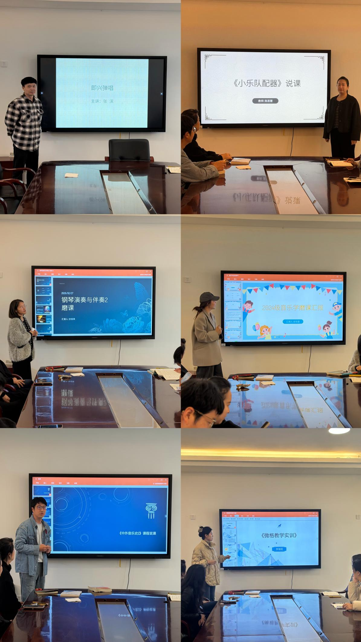 本次磨课严格按照系部要求,围绕本学期开设的《即兴弹唱》《小乐队配器》《中外音乐史2》《微格教学实训》《钢琴演奏与伴奏2》《声乐4》六门课程展开。老师们准备充分,结合教材、教学进度计划、考核方案及说课PPT,从学情分析、教材解读、课程目标设定、进度安排合理性、考核方案对应性等方面进行了详细阐述。