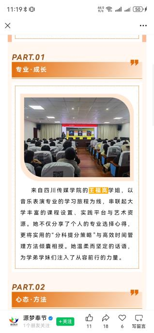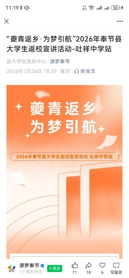 此次“母校行”活动得到了各高中学校、艺考培训机构及广大师生的热烈欢迎与高度认可。其中,王福岚同学的“母校行”活动被源梦奉节(奉节县大学生就创中心)公众号发布,得到良好反响;程可之同学也被母校华容县第一中学聘为学长帮帮团活动生涯规划指导老师。